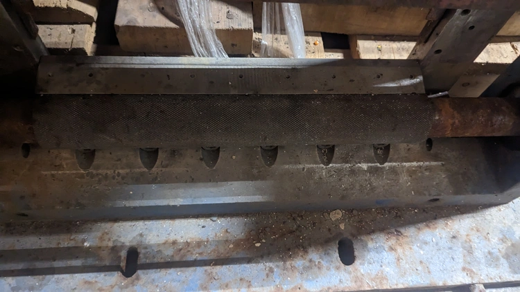 Upper feed roll frame for Cumberland 14 pelletizer built up to 1975, serial numbers starting with 54XXX, includes lower feed roll and bedknife holder and stripper
