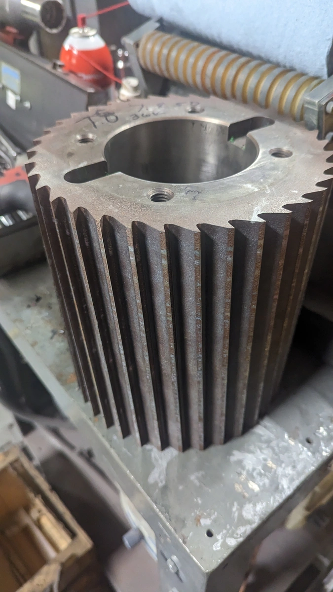 One used 8" Cumberland pelletizer helical rotor. Material is believed to be D2 and manufactured by Topsall Machine Tool. 36 blades in good condition. OD is 7.850