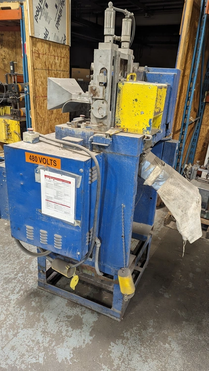 Cumberland Model 6 pelletizer, pneumatically actuated rubber upper feed roll, serrated lower feed roll. 480/3/60. 15 HP AC Motor and Drive. We will include a set of sharp rotor blades.