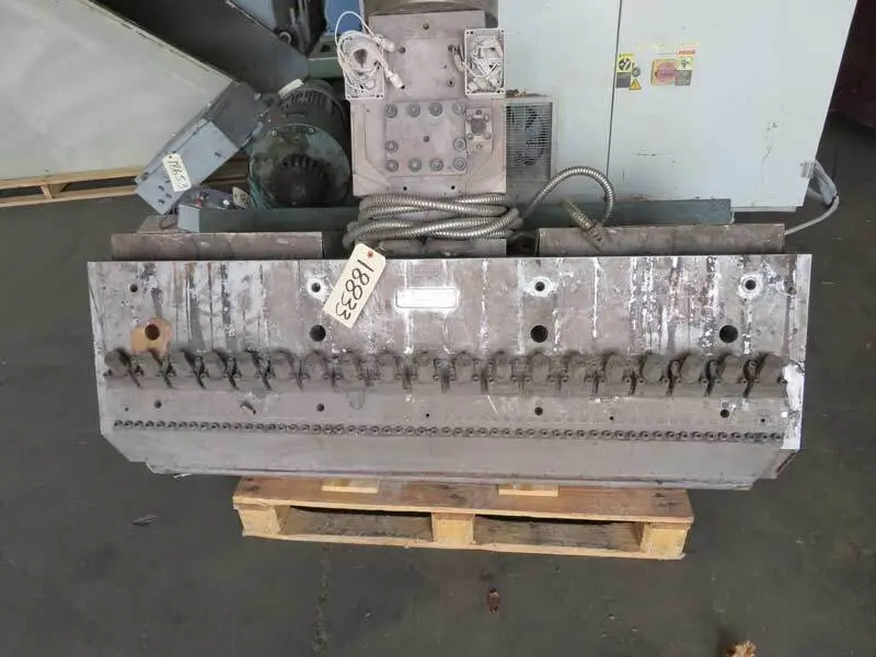 45-degree restrictor bar. .100" flex adjustment. Coat-hanger manifold. 2.5" back enter entrance. Includes co-ex block and static mixer. Last ran polypropylene with a 8" 900 HP extruder and a 75mm 75 HP extruder.